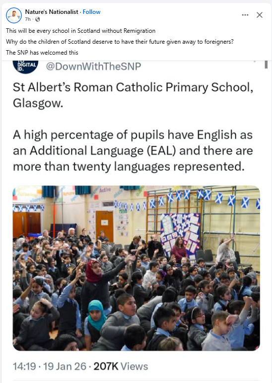 Josh Fernie (or “Nature’s Nationalist” on Facebook), is an ethno-nationalist involved with AAIM. He has ties to the Homeland Party, a fascist party that calls for the “remigration” of “non-native” peoples of the British Isles, i.e. ethnic cleansing. Here is a post he shared, targeting children of colour in a school in Glasgow. (Click for images).